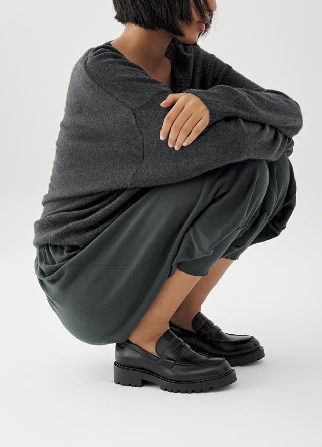 Die edgy Edition Kenova ist eine moderne Interpretation des klassischen Loafer-Designs. Der klobige Schuh ist aus schwarzem Leder gefertigt.
