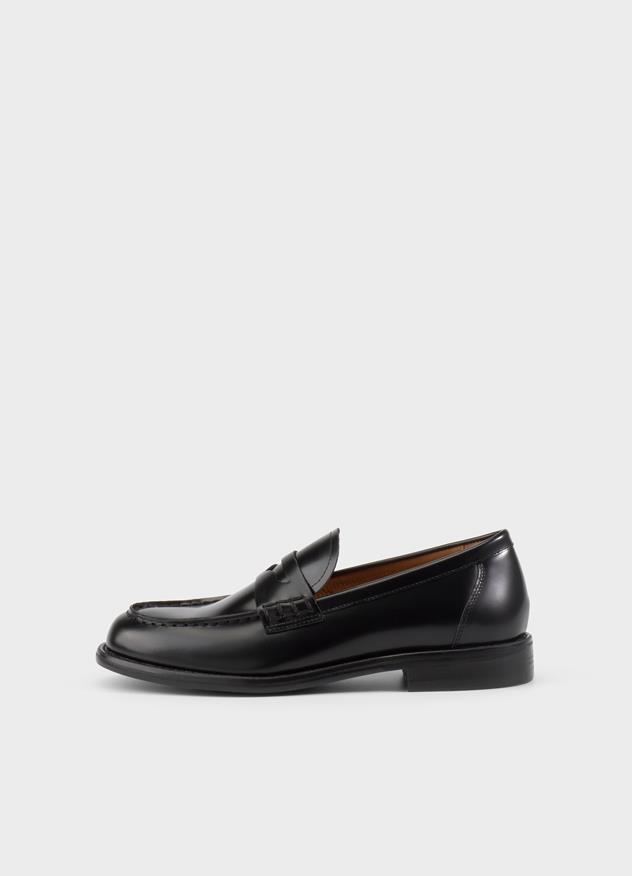 Wir finden, Linn ist der perfekte Pennyloafer. Das klassische Modell aus poliertem, schwarzem Leder verfügt über eine Moc-Toe-Naht. Die Laufsohle hat einen dünnen Gummieinsatz für optimalen Halt.