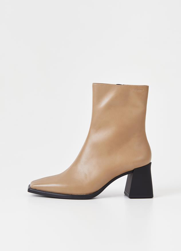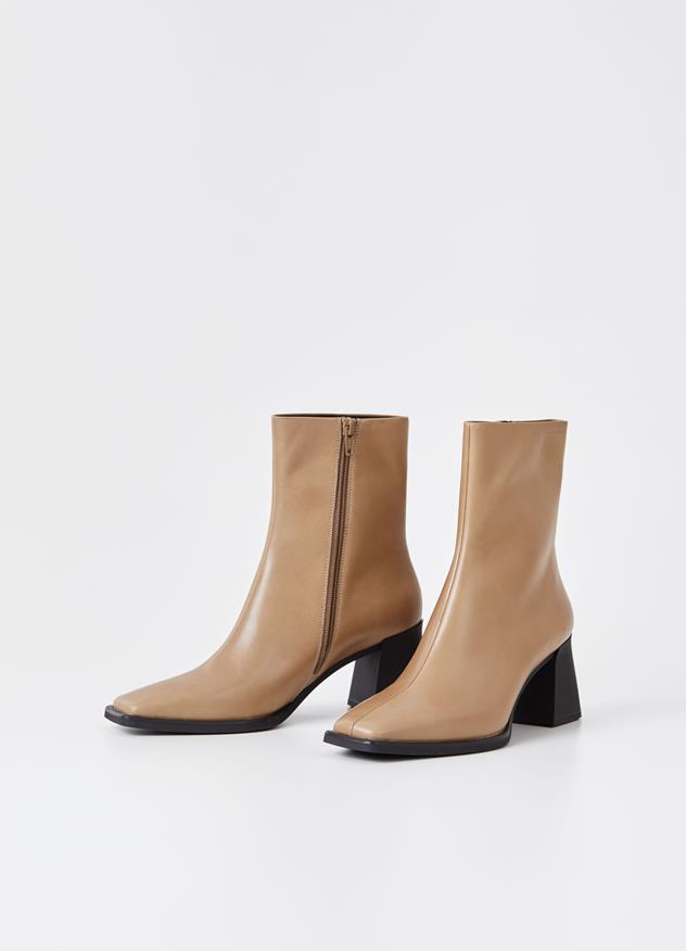 Modern ankle boots Hedda bring a retro aesthetic. The style is crafted in smooth beige leather featuring square toes, a mid-rise shaft and inside zippers. The flared heels measure 70mm.