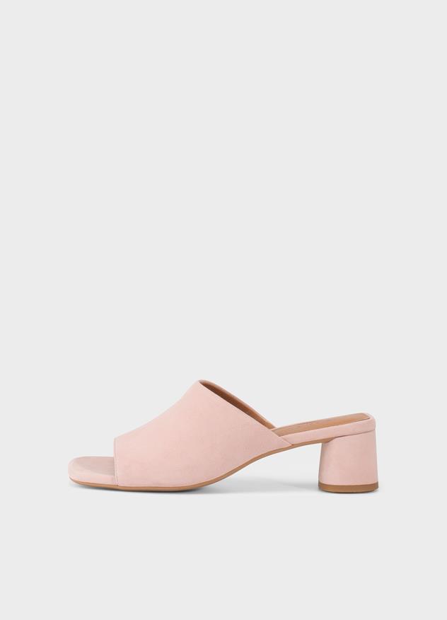 Die Edition Piper präsentiert ein Paar klassische Mules mit Absatz. Das elegante Modell ist aus rosafarbenem Wildleder mit einem weichen Obermaterial gefertigt.
