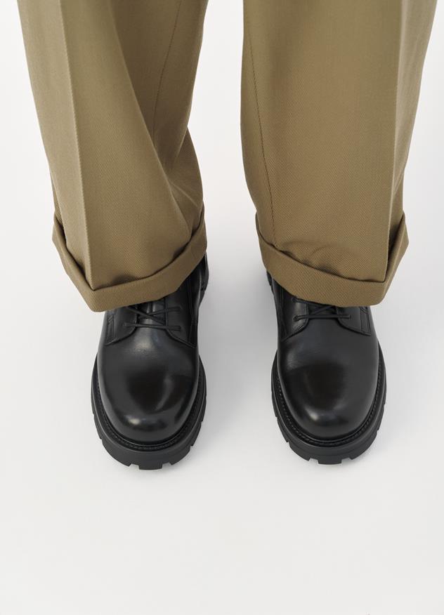 Cameron er chunky snørestøvletter til hverdagsgarderoben. Den er lavet i sort læder med rund tåform, snørebånd og lynlås på siden. De rillede ydersåler er 40 mm. Detaljen: hælstrop.