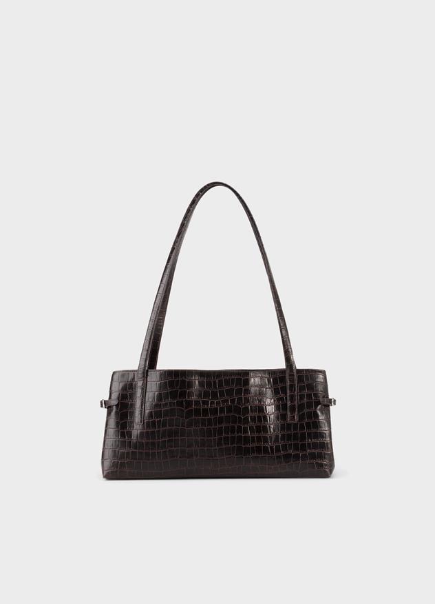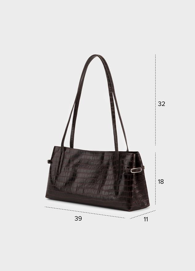 En mindre version af vores ikoniske Cannes-taske. Denne model er fremstillet af mørkebrunt læder præget med krokodillemønster og har spænder i siderne, så den kan tilpasses forskellige størrelser og former.