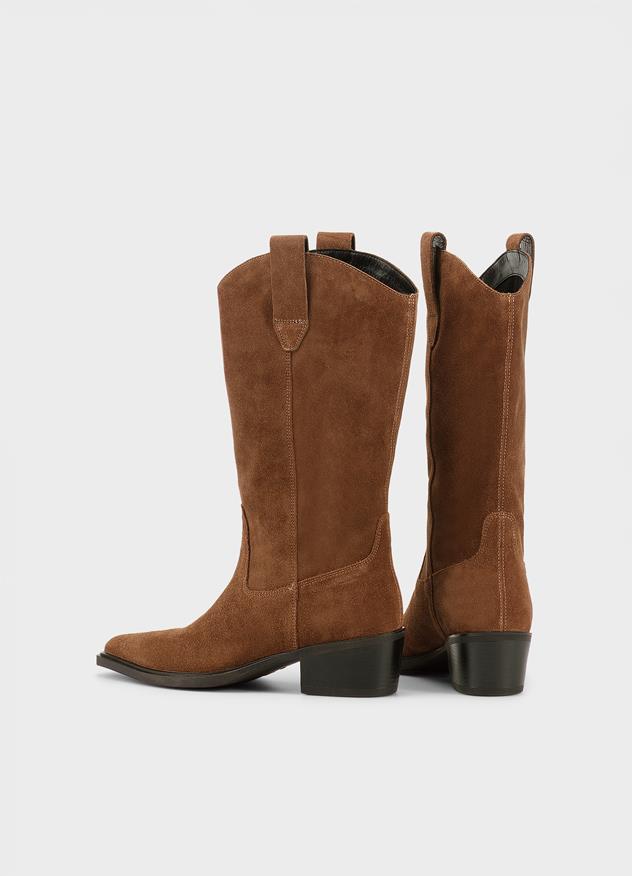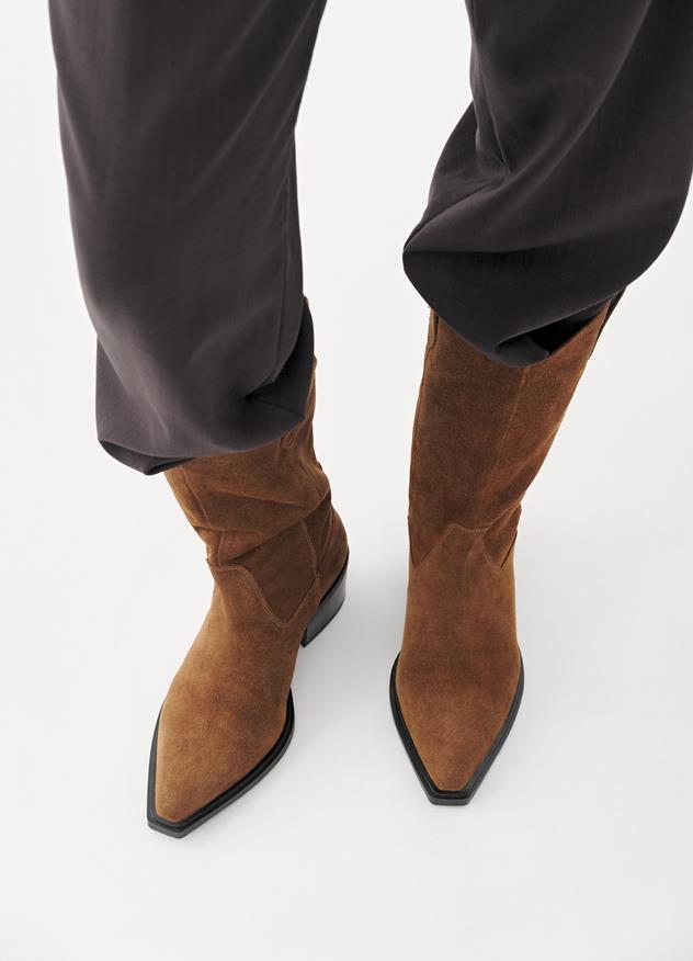 Edition Kelsey balancerer klassiske silhuetter med subtile western-inspirerede detaljer. Støvlen går til læggen og er fremstillet af brunt ruskind.