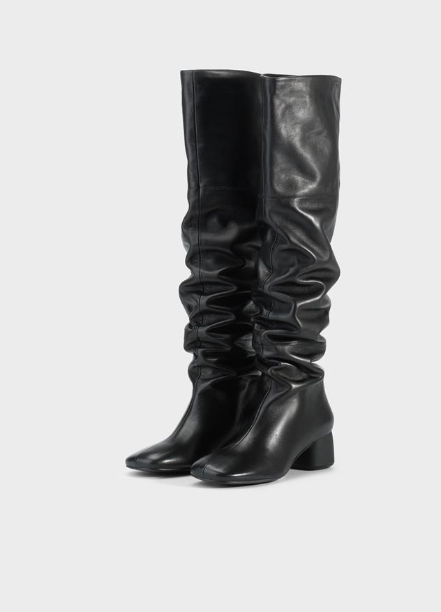 Edition Livia presenta unas botas altas de estilo llamativo. Este modelo de caña arrugada está confeccionado en cuero negro y destaca por su diseño atrevido con una puntera suavemente redondeada. Se pueden llevar como botas mosqueteras o bien arrugadas sobre la rodilla.