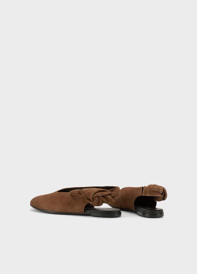 Aleya reimagines the modern flat with its high-cut upper and rounded toe shape. The flat is crafted from brown suede and features a slingback strap with a large bow.