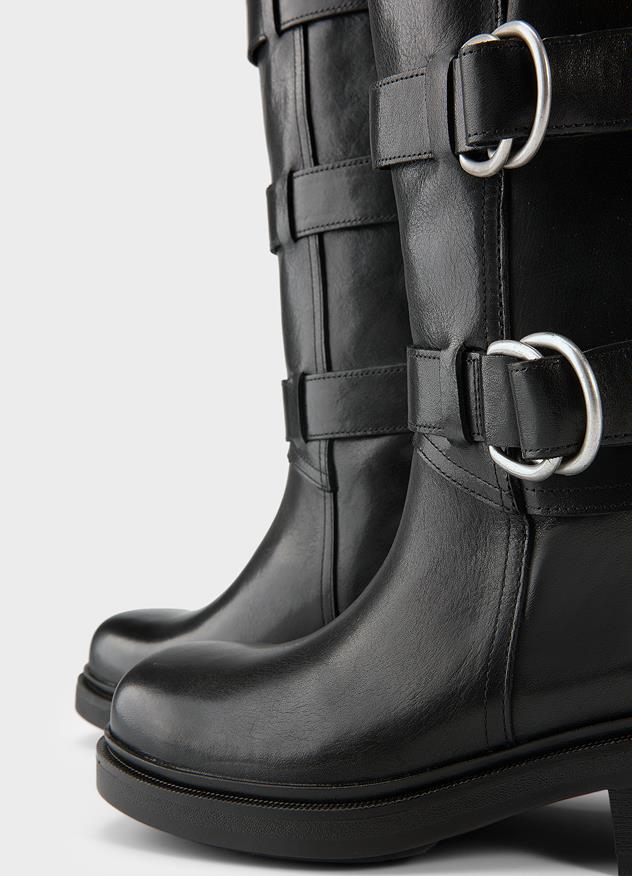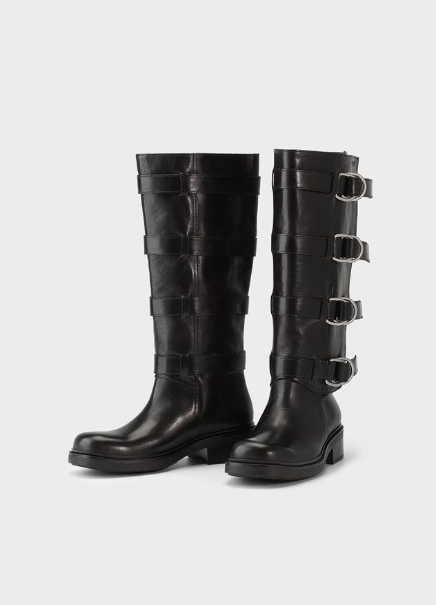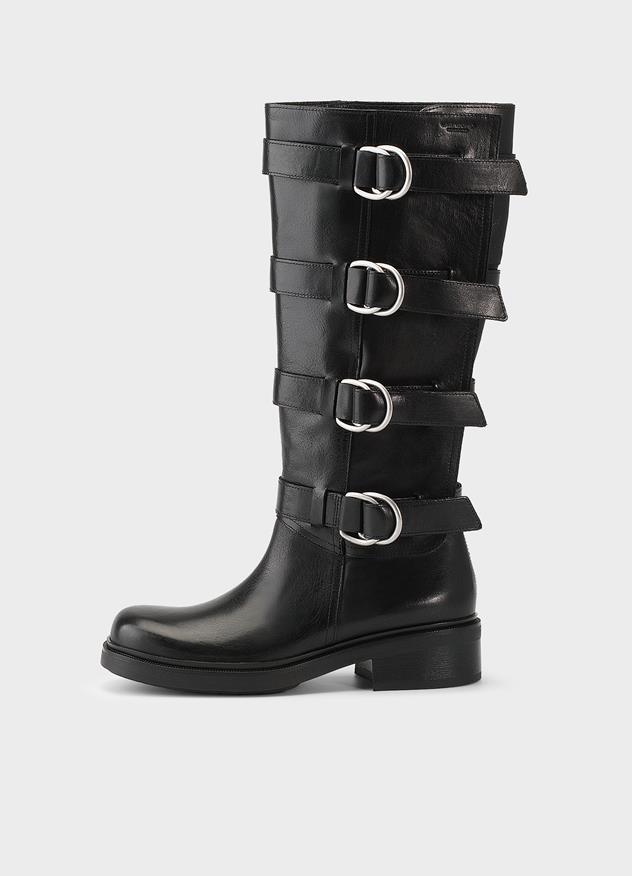 Edition Karlie blends a vintage-inspired look with a bold character. The rounded toe shape and sculpted heel add attitude to the silhouette. The tall boot has a spacious, black-leather shaft with a shrunken effect. The style features decorative straps with double D-ring buckles along the shaft.