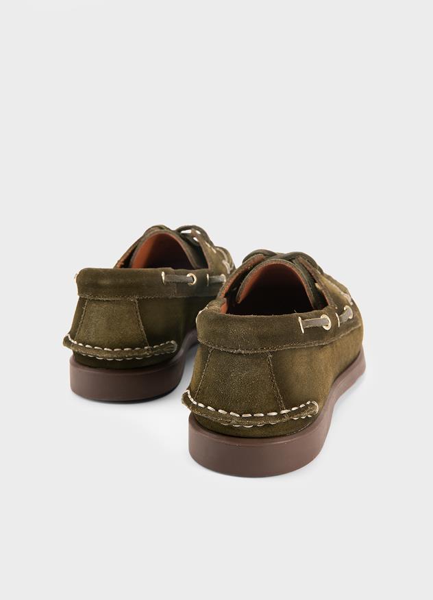 Loui M blends classic boat shoe elements with a streamlined silhouette. The style is crafted from dark khaki suede.