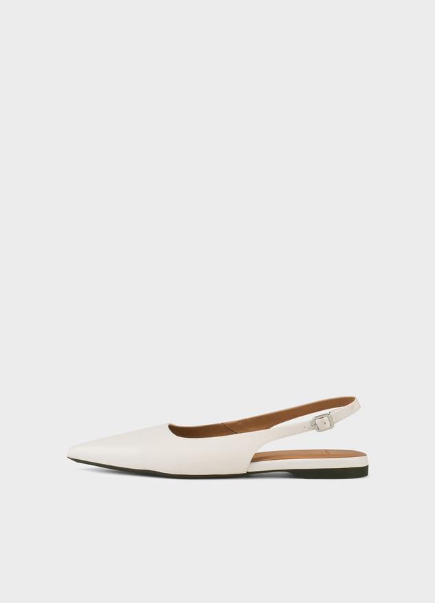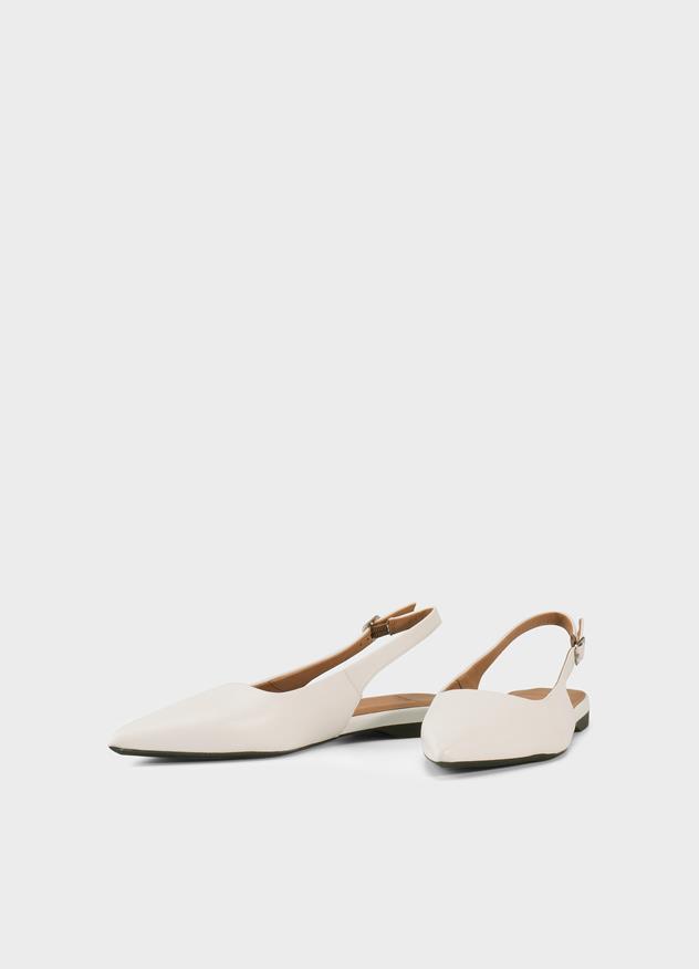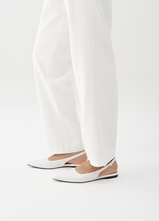 Το Hermine είναι ένα κομψό σχέδιο της Edition, με χαρακτηριστική μυτερή γραμμή μπροστινού. Το slingback flat είναι κατασκευασμένο από λευκό δέρμα.