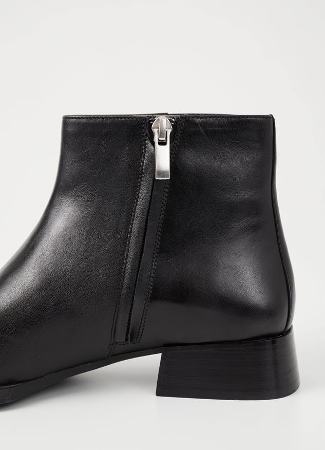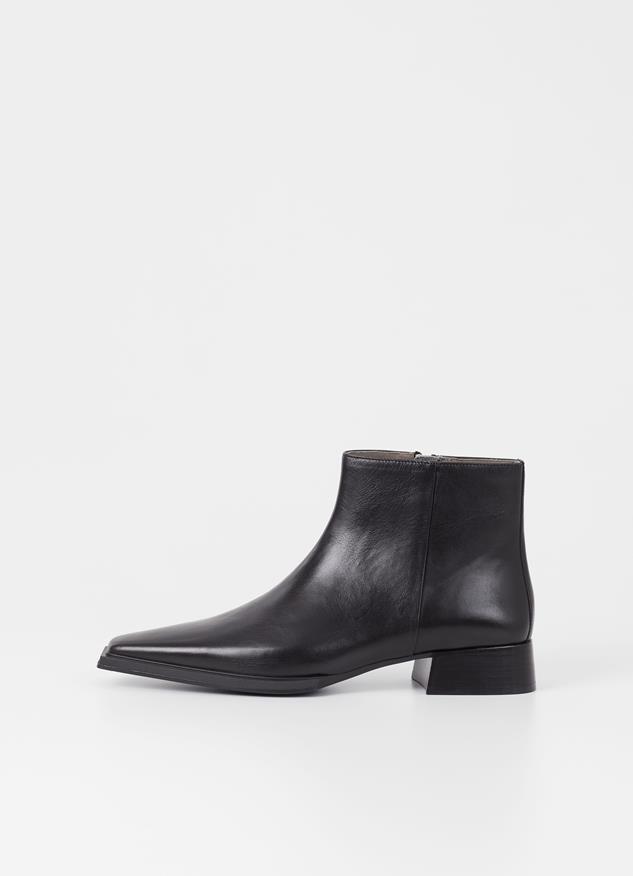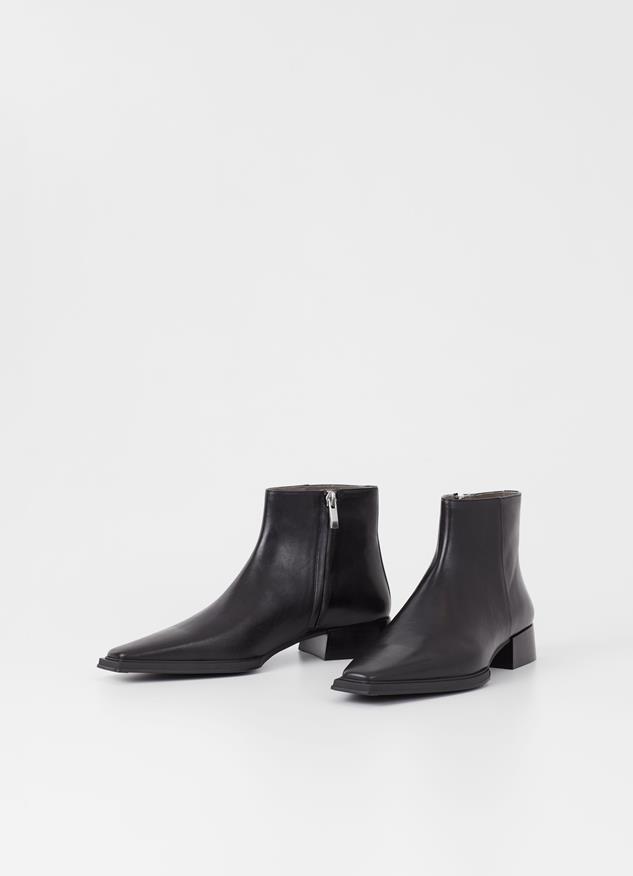 Eida egy kortárs bokacsizma minimalista megjelenéssel. A modell fekete, selymes bőrből készült hosszúkás orr résszel és belső oldalán cipzárral. Az elegáns blokk sarok magassága 32mm. További jellemzői közé tartozik a bőrrel bélelt belsőrész.