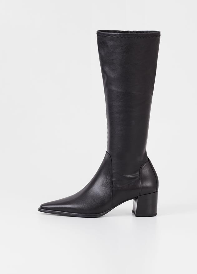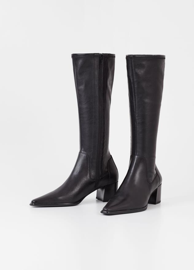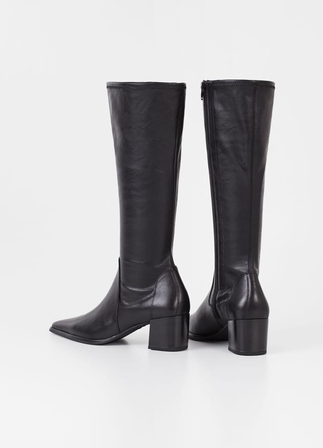 Letisztult kialakítás, minimalista részletekkel. A térdig érő Giselle csizma felső része fekete bőrből, szárrésze pedig rugalmas szintetikus bőrből készült. Részletei közé tartozik a cipzárral záródó oldalak, az 57 mm magas blokk sarok és a hegyes orr. A bőr talpbetét krómmentes bőrből készült.
