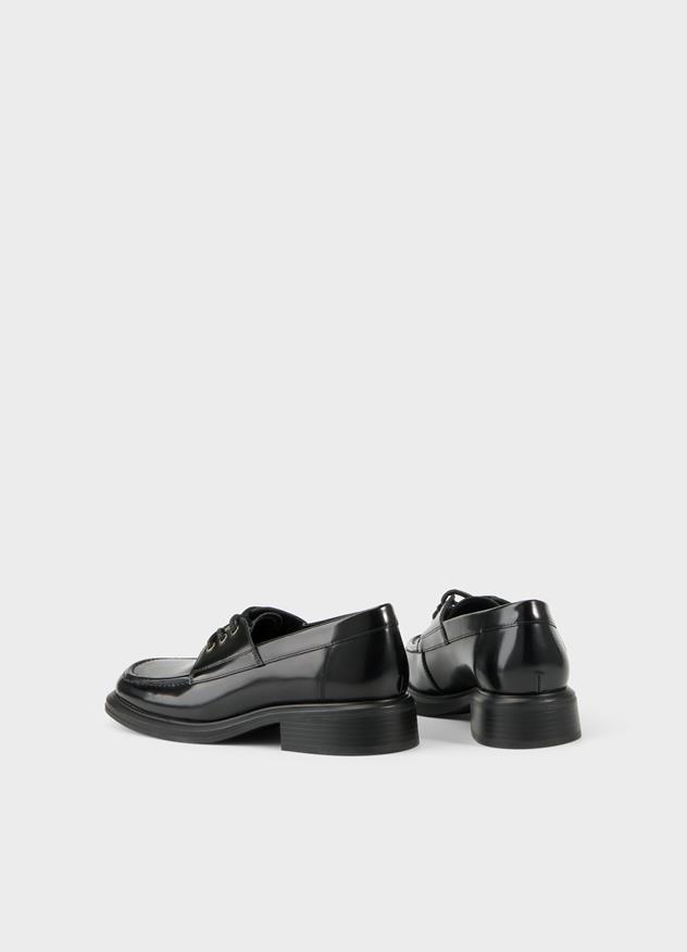 Una rivisitazione contemporanea dell'intramontabile scarpa da barca. Ellis è realizzata in pelle nera lucida e presenta una chiusura con lacci, punta squadrata e cuciture decorative. I dettagli includono una fodera e una soletta in pelle priva di cromo.