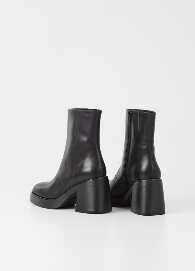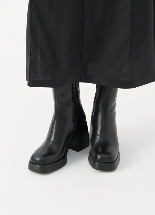 Brooke is the modern platform boots with a retro-inspired design. The style is crafted from black leather featuring a mid-rise shaft, square toes and inside zippers. The chunky block heels measure 87mm.