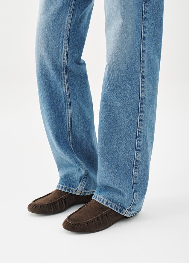 Aleya réinvente le mocassin doux moderne. Ce modèle à bords hauts est confectionné en daim marron foncé et présente des détails froncés sur le bout.