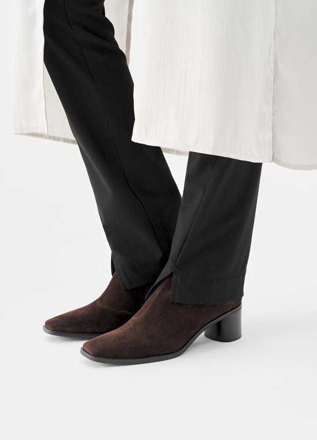 Met een subtiel vierkante neus en een zacht afgeronde, middelhoge hak is Fay een veelzijdige favoriet. De enkellaars is gemaakt van donkerbruine suède.