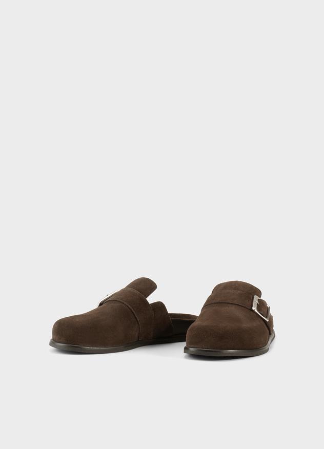 Effie er hverdagssandaler designet med myke innersåler i semsket skinn. Disse mulesene er laget i mørkebrunt semsket skinn og dekorert med en oversized spenne på oversiden.
