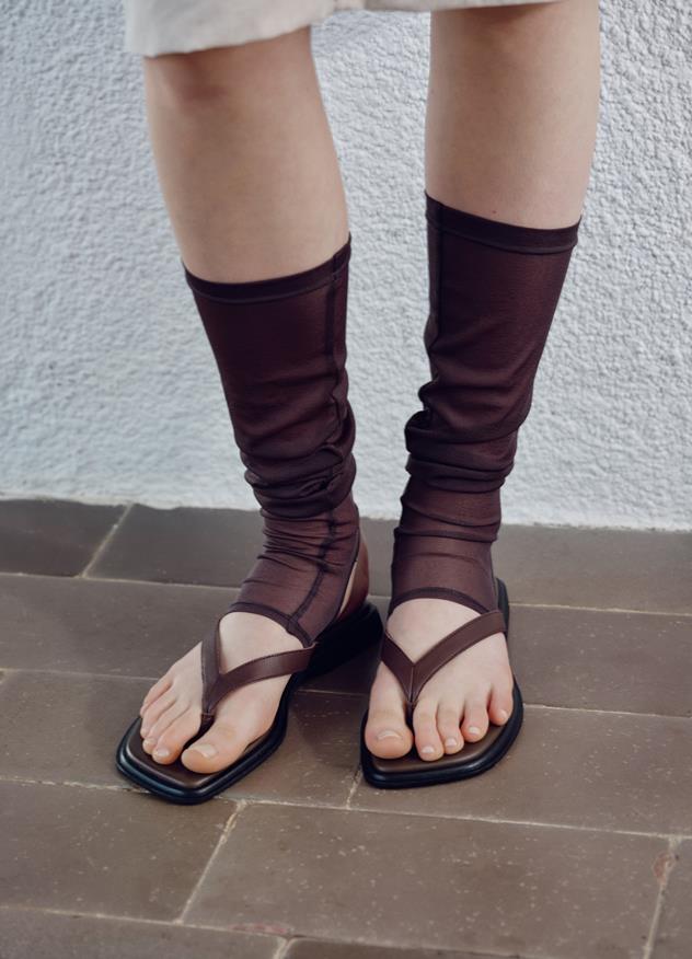 Eleganckie klapki japonki o minimalistycznym designie. Model Izzy ma kwadratowy nosek i został wykonany z ciemnobrązowej skóry.