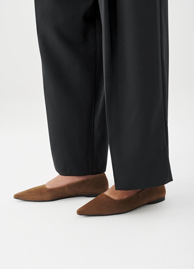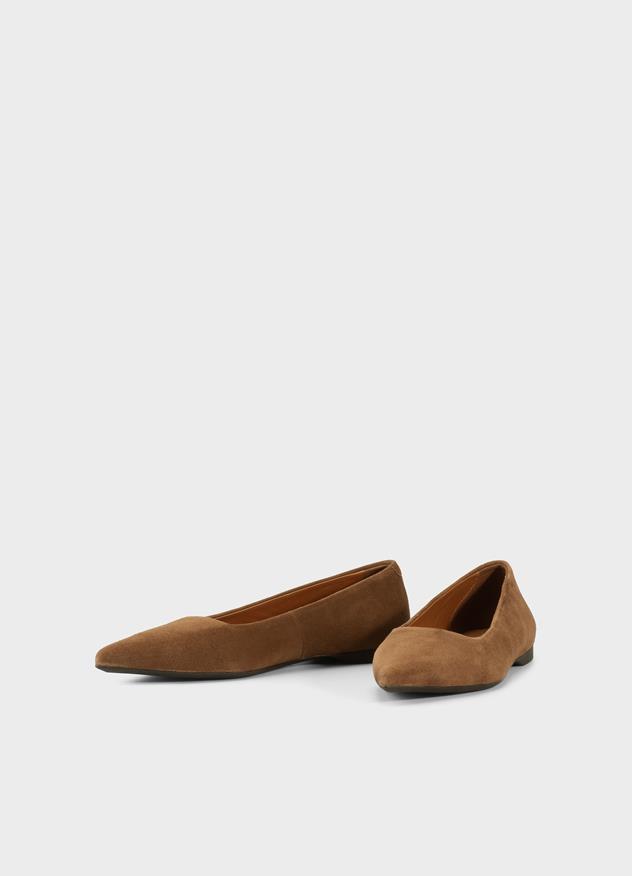 Hermine este un balerin elegant, caracterizat prin vârful fin ascuțit. Acest model este confecționat din piele întoarsă maro.