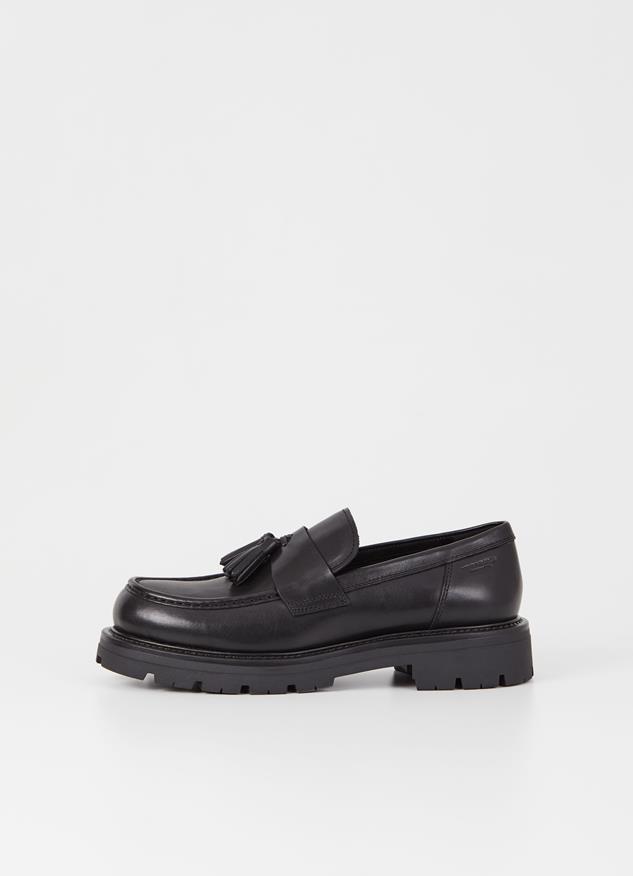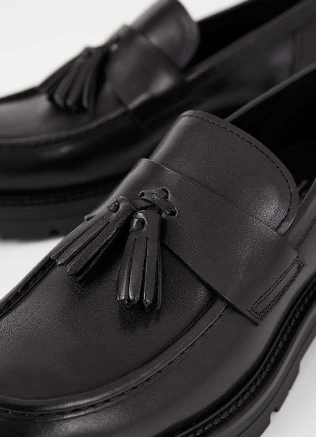 Cameron är klassiska loafers med en solid design och distinkta detaljer. Modellen är gjord i svart skinn med tofsdetalj fram, dekorativa moc toe sömmar och rund tåform. Den robusta sulan mäter 40 mm