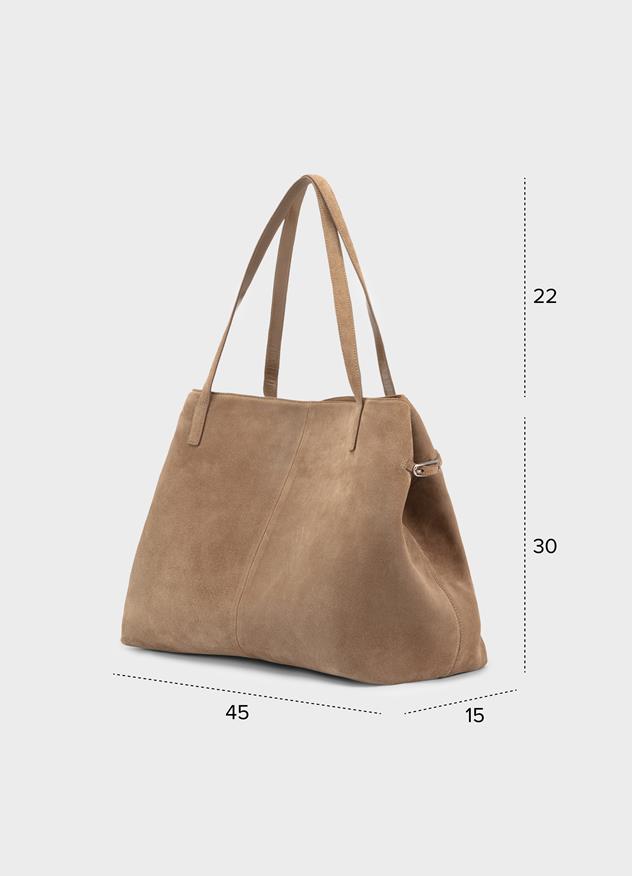 Cannes är vår tolkning av den klassiska handväskan. Designen är gjord i mörk, sandfärgad mocka och har spännen på sidorna, vilket gör att den kan anpassas till olika storlekar och former.