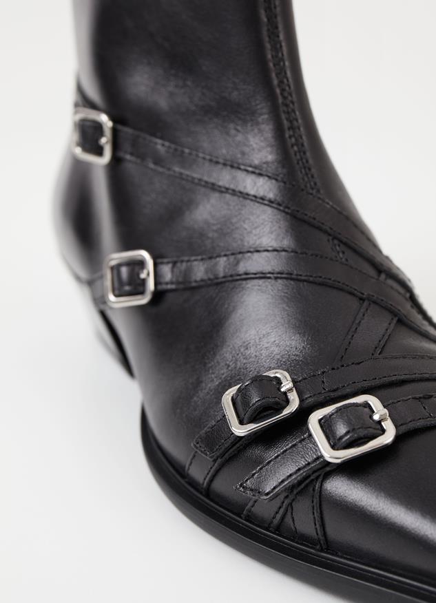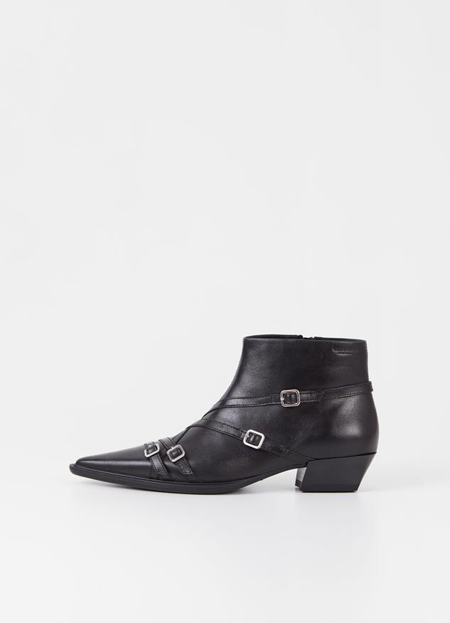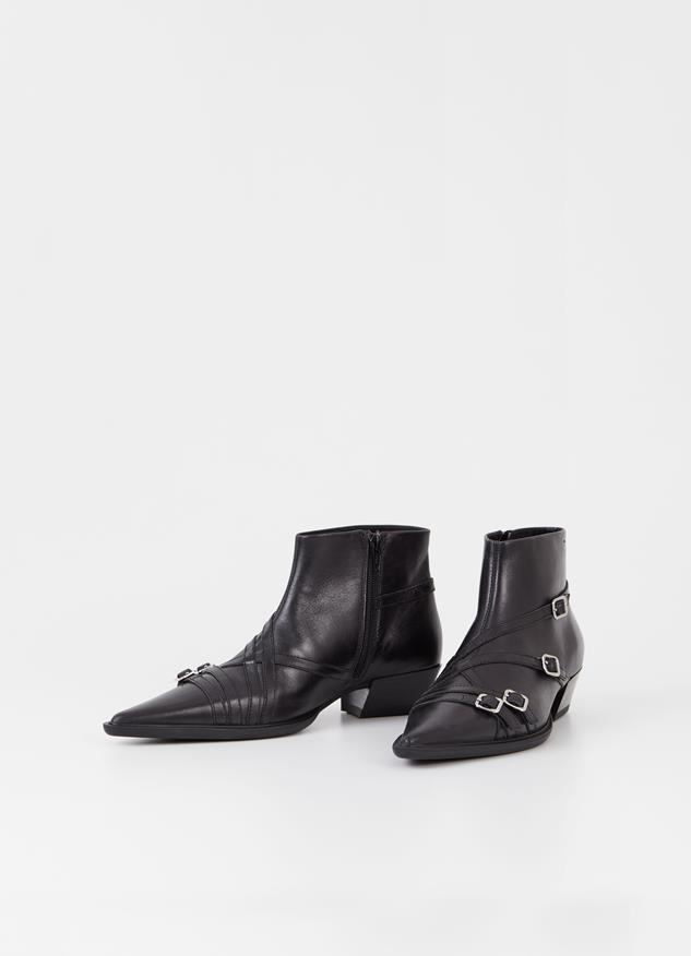 Cassie är ankelboots med en avsmalnande silhuett. Modellen är i svart skinn med dekorativa spännen på ovandelen, spetsig tå och vinklad klack. Detaljer inkluderar dragkedja längs insidan av skaftet. Klacken mäter 40 mm.