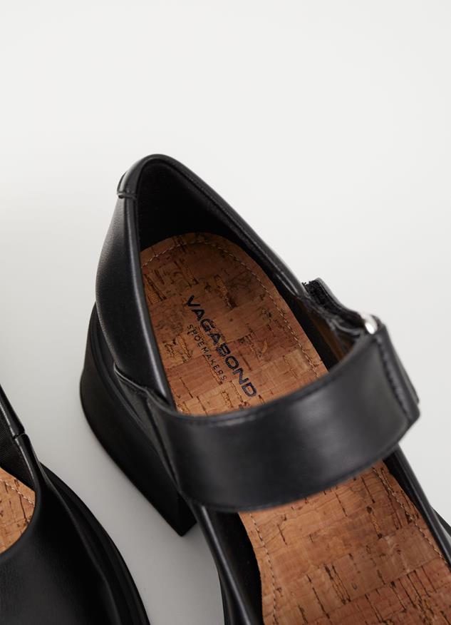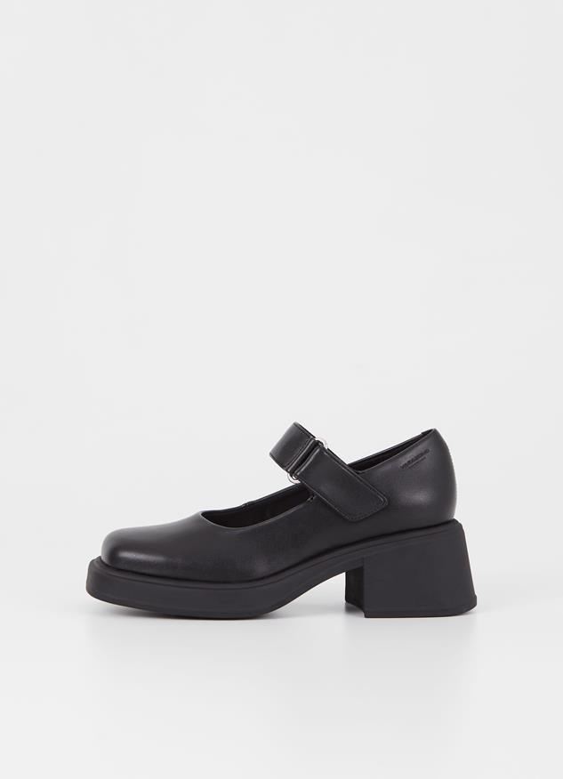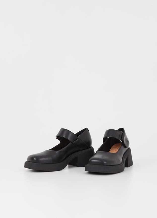 Dorah är Mary Jane-skor med platå fram. Modellen är del av vår Non-animal kollektion och är tillverkad av svart syntetiskt PU material utan animaliskt ursprung. Detaljer inkluderar fyrkantig tå och justerbar ankelrem. Blockklacken mäter 59 mm.