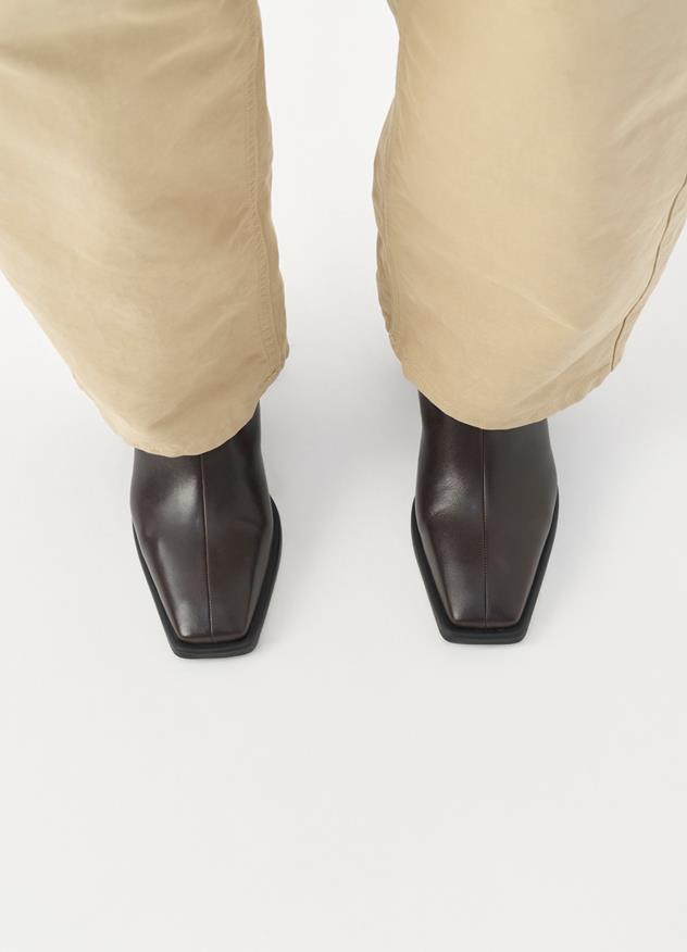 Vår Edition Hedda har en tidlös design. Modellen är i mörkbrunt skinn och har en subtilt fyrkantig tåform. Detaljer inkluderar en mittsöm, dragkedja längs insidan och 70 mm utsvängd klack. Innersulan är i kromfritt skinn.