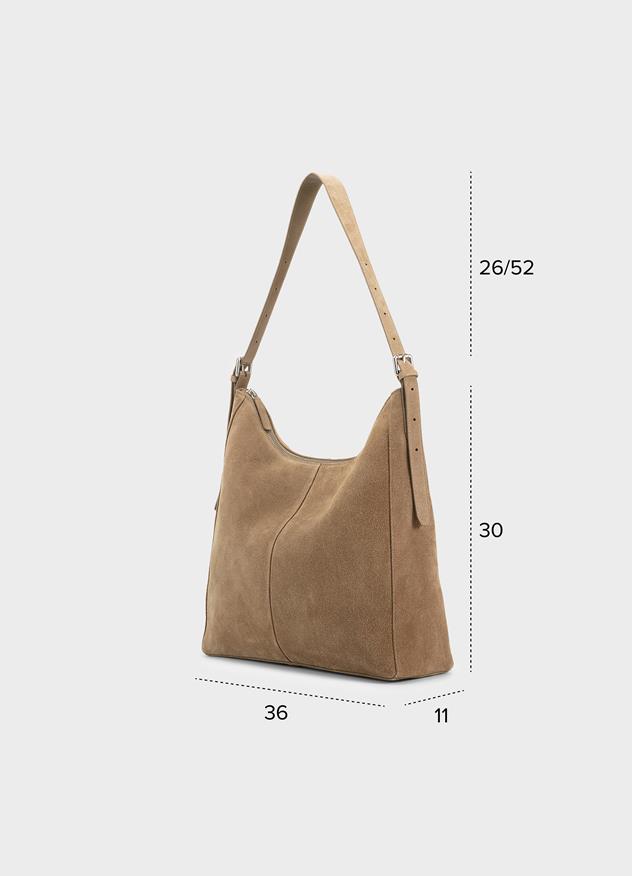 Hilo är en minimalistisk axelremsväska med avskalad design. A-linjemodellen är i mörk sandfärgad mocka. Insidan är i 100 % ekologisk bomull och har en mindre innerficka med blixtlås.