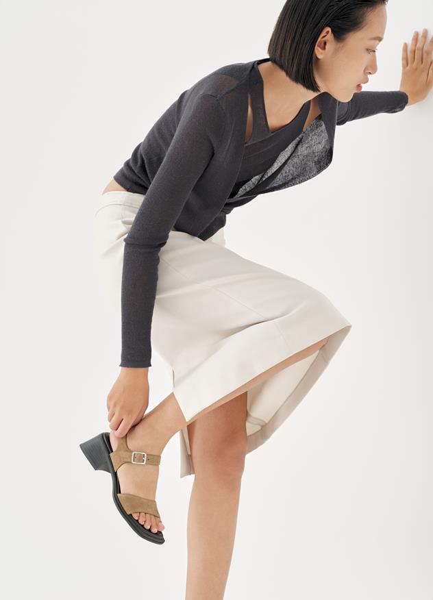 Högklackade sandalerna Ines adderar en modern touch till alla looks. Modellen är i ljusbrun mocka med breda remmar.