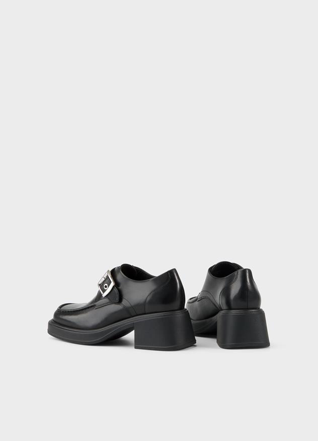 A sartorial classic with a 90s aesthetic. Dorah monk shoe is set on a 59 mm heel and crafted from black leather. The style has a monk strap with a silver-toned buckle. Details include a square toe shape and leather insock.