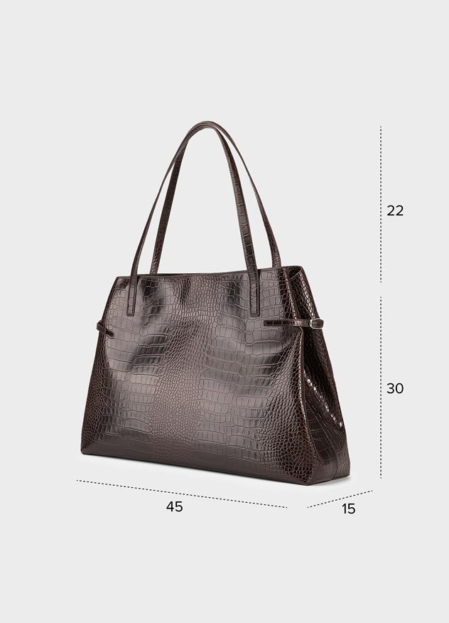 Cannes is our interpretation of the classic handbag. The design is crafted from embossed dark brown leather with a croco pattern. Cannes features buckle closures on the sides, allowing it to adapt to different sizes and shapes.