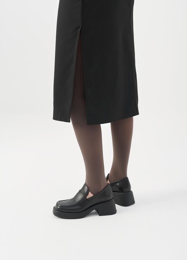 Dorah is the contemporary loafers with a mid-heel silhouette. The style is crafted in black leather featuring a square toe shape and a decorative leather strap across the upper. The solid block heels measure 59mm.